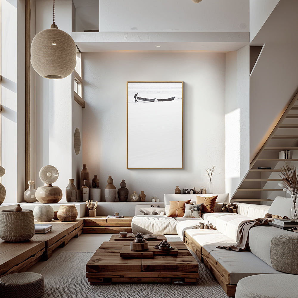 צילום בשחור-לבן של דייג מושך סירה אל החוף
