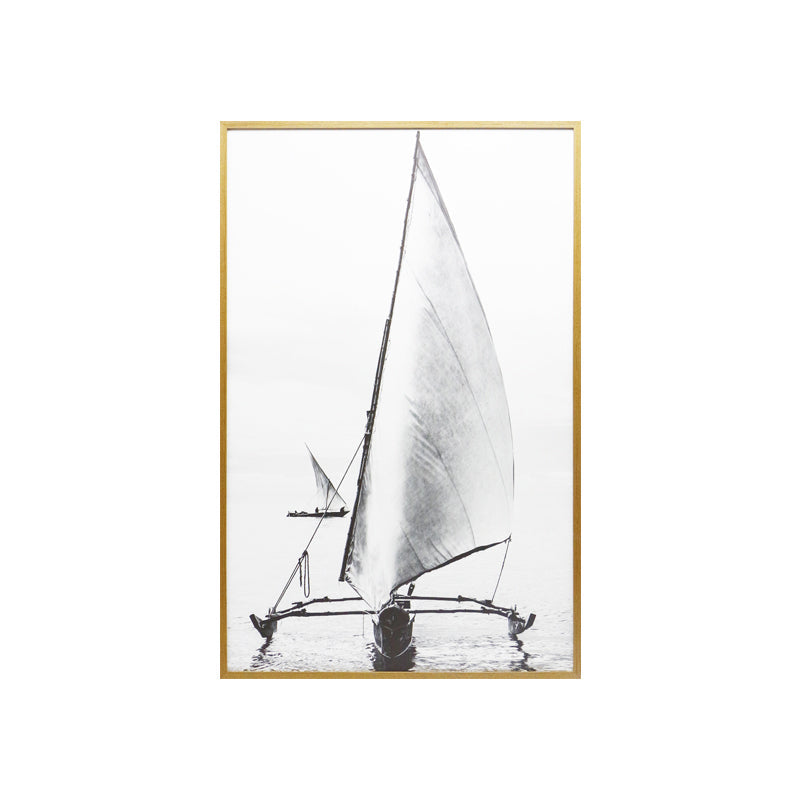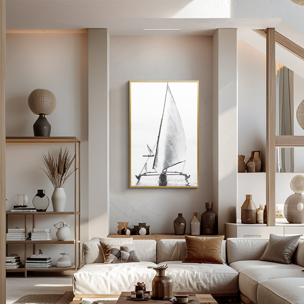 צילום בשחור-לבן של סירה עם מפרש מתוח, שטה ברוגע על פני המים