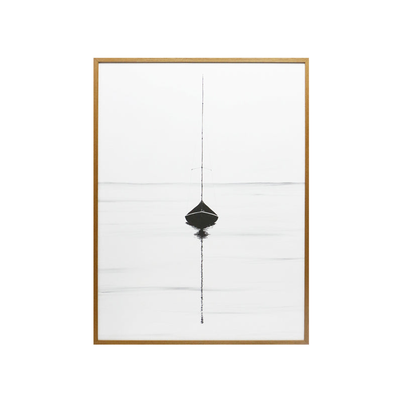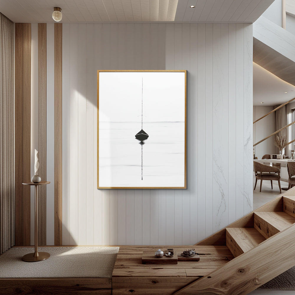 סירה בודדה במרכז הפריים יוצרת סימטריה מושלמת עם השתקפותה במים