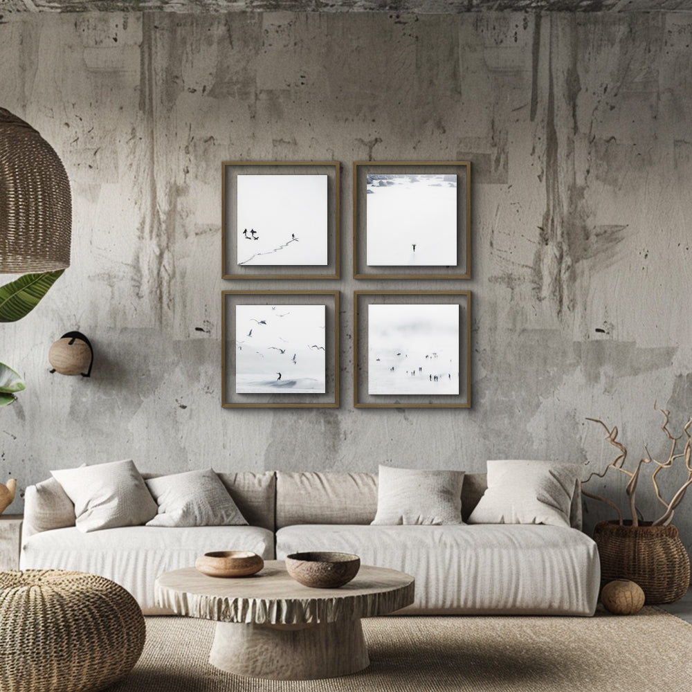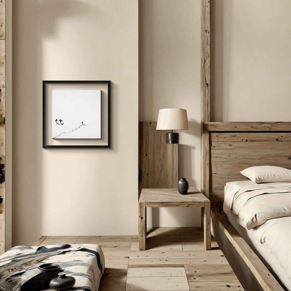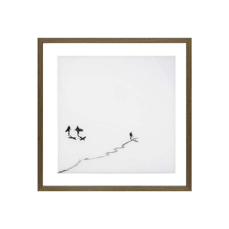 שלושה דמויות וכלב משאירים עקבות מתפתלים בתוך לבן אינסופי