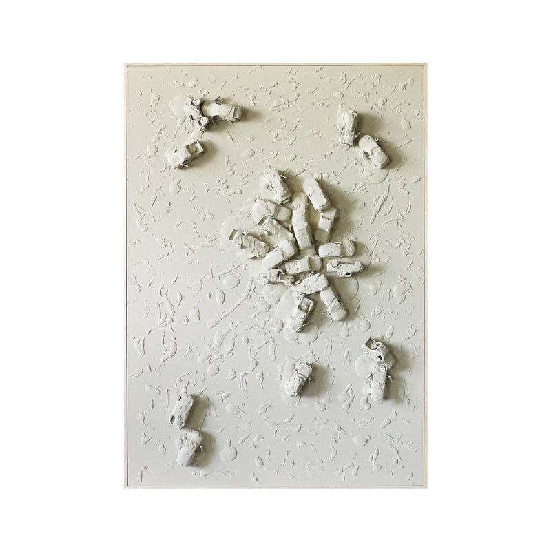 רכבים קטנים מפוזרים בתנועה קפואה יוצרים קומפוזיציה של כאוס אורבני בתוך שקט ל
