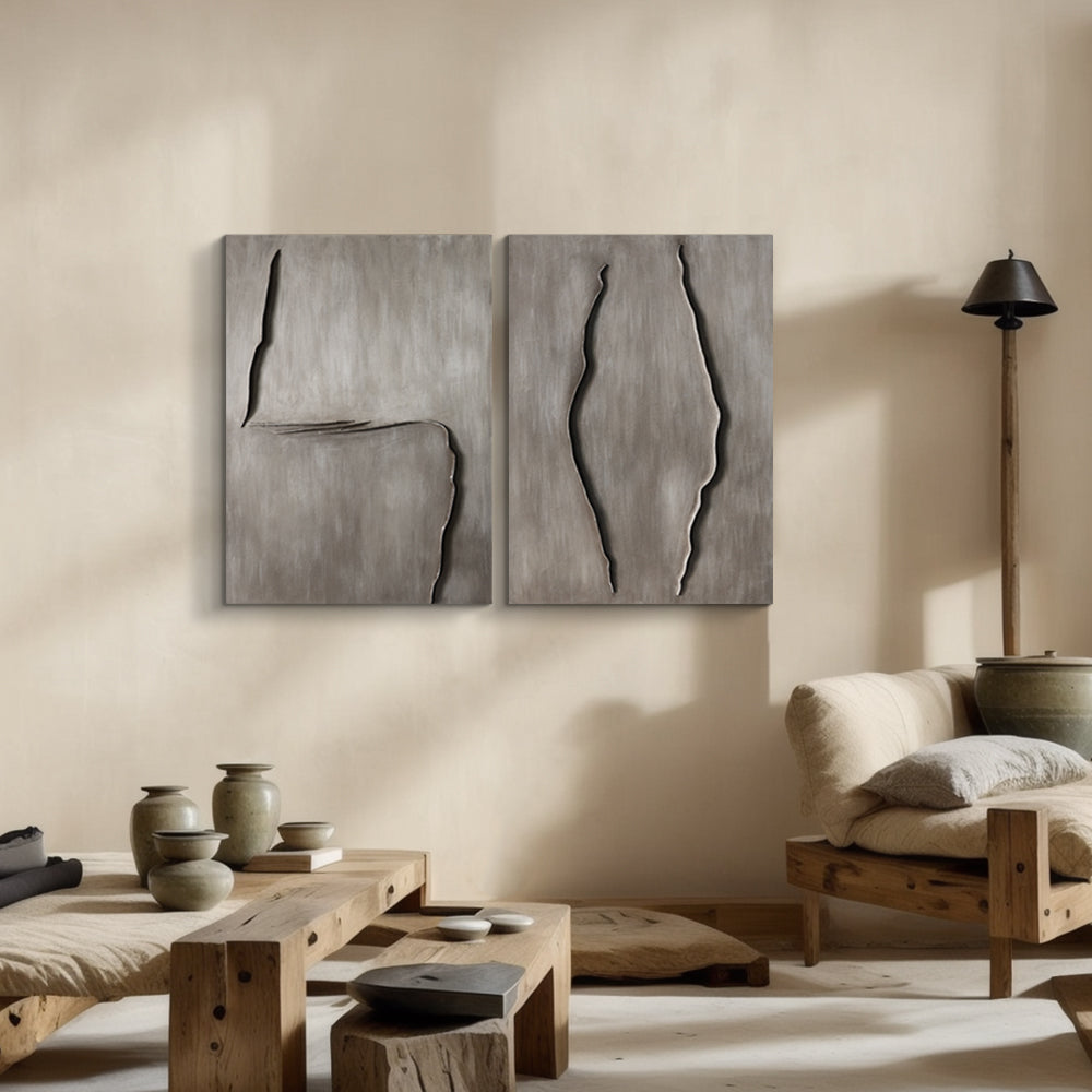דיפטיך של שברים חרוטים במשטח כהה, כמו דיאלוג בין פצעי הזמן