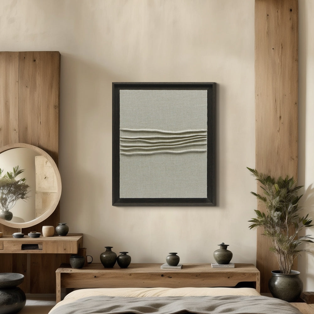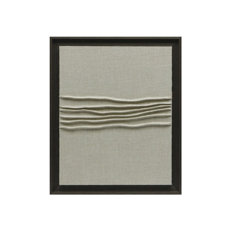 קפלים אופקיים בבד יוצרים קצב מדוד ומרגיע, כמו גלים דוממים או קווי נוף רחוקים