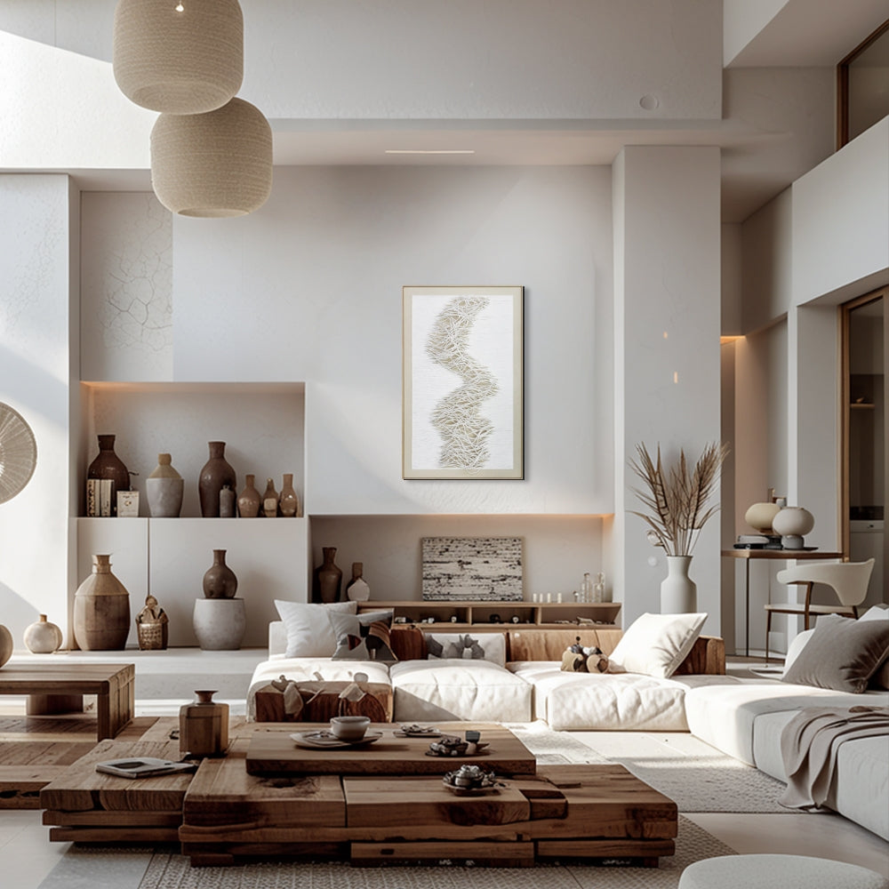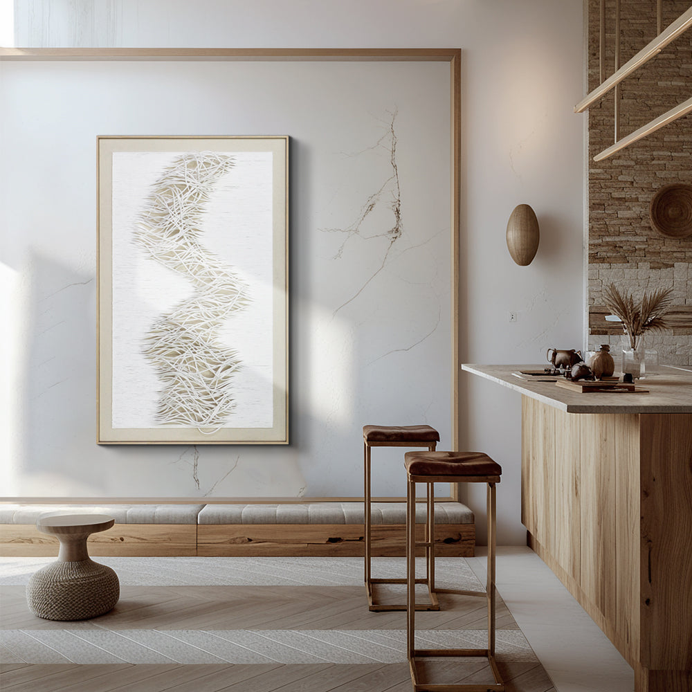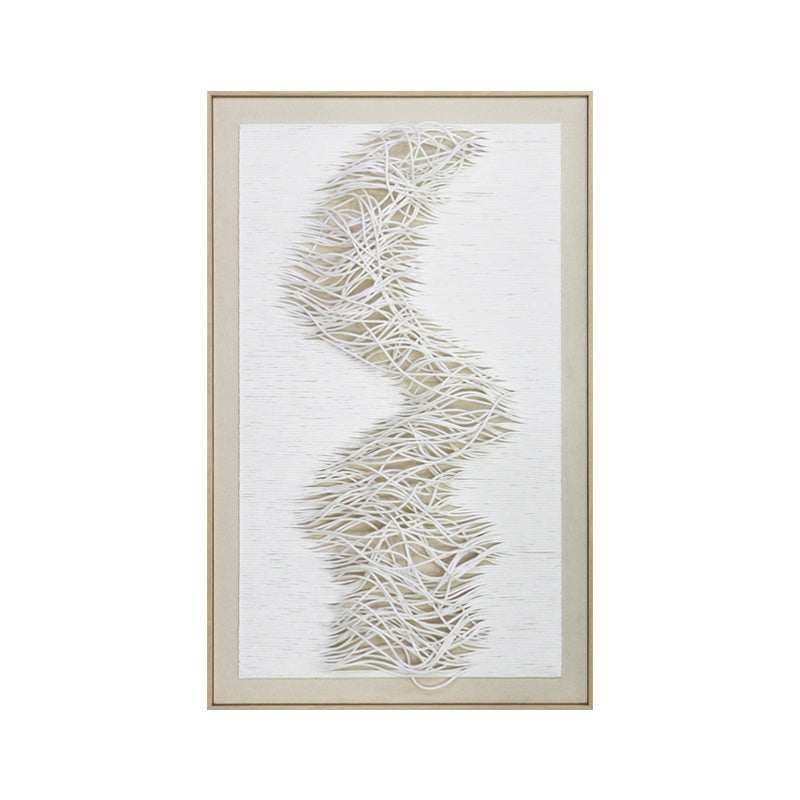 שזירה מופשטת של חוטים לבנים יוצרת תנועה טבעית המזכירה נהר או שדה עשב ברוח