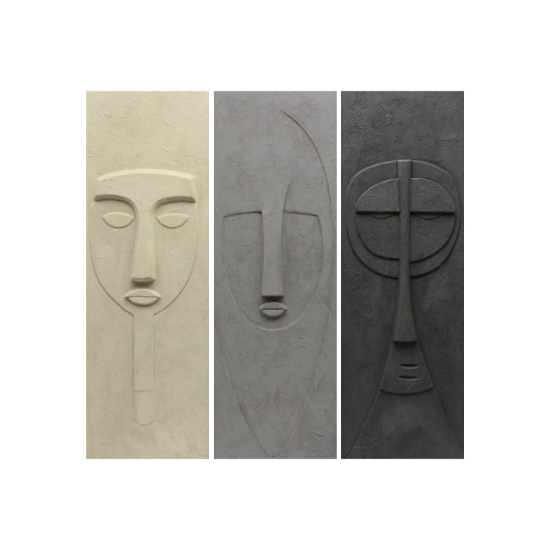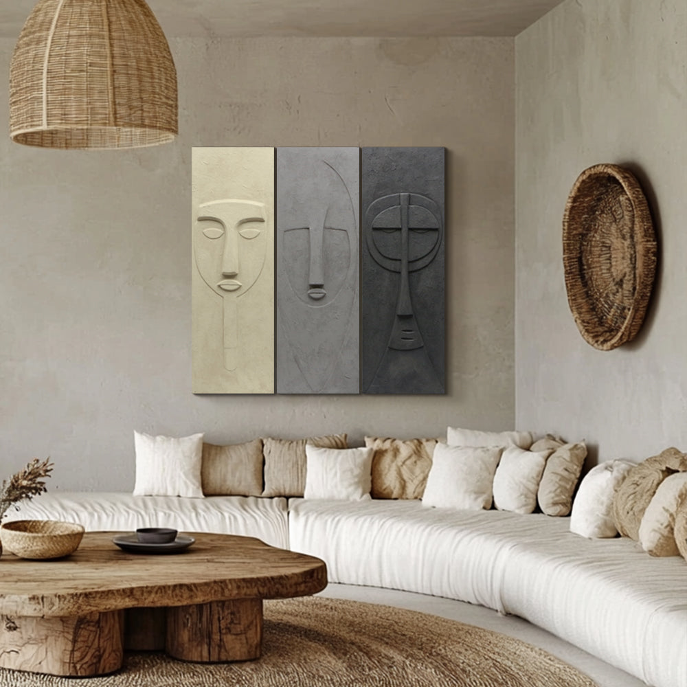 טריפטיך פיסולי של שלוש מסכות מופשטות, חוקר זהות, מבט ורגש במינימליז
