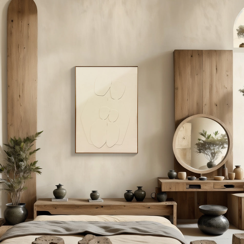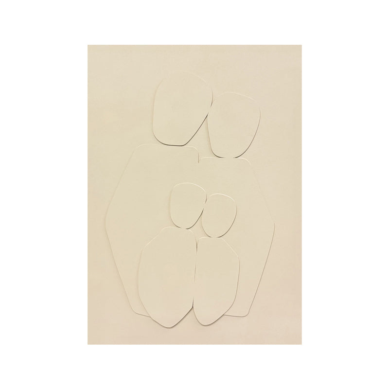 קומפוזיציה מופשטת של דמויות קרובות בתוך משטח בהיר
