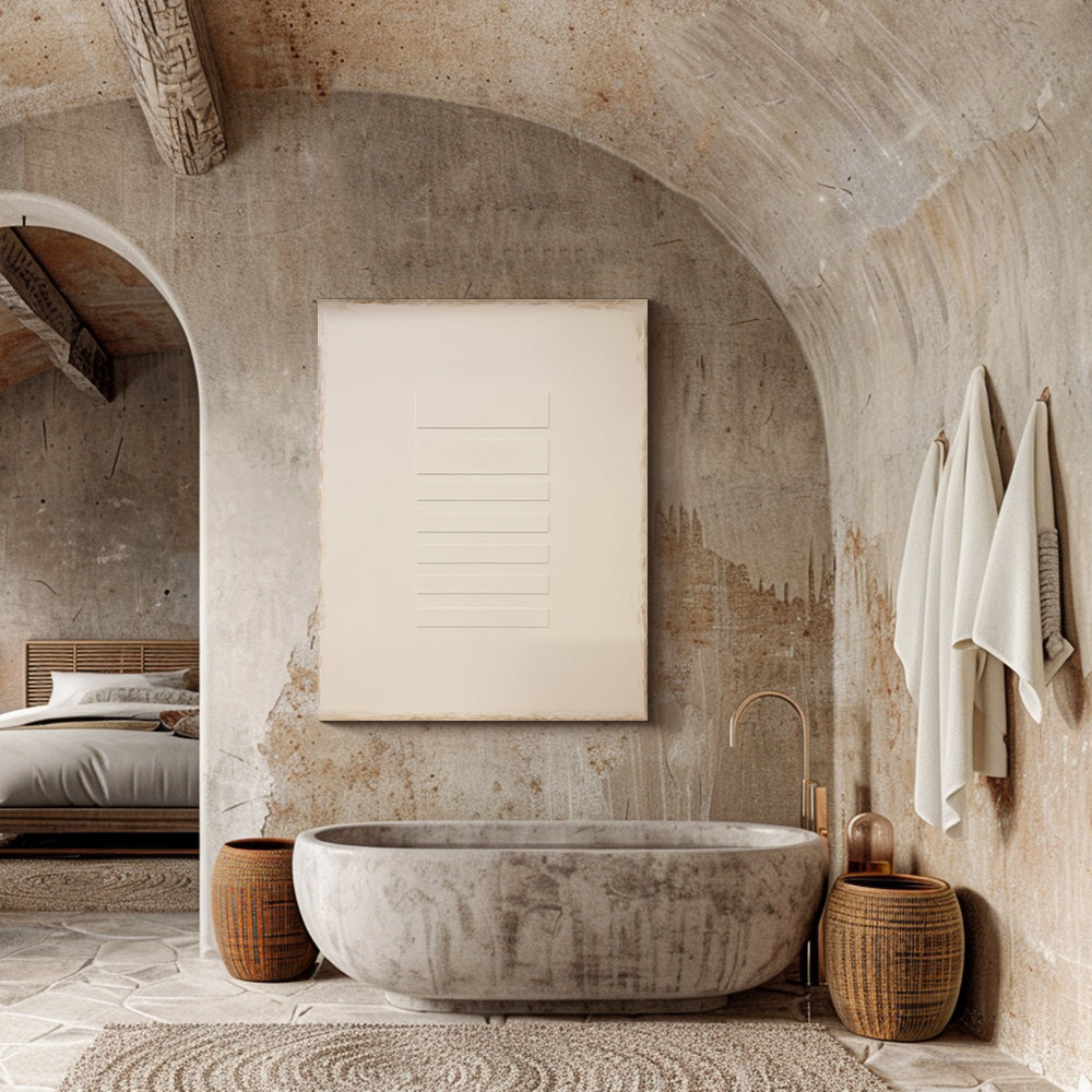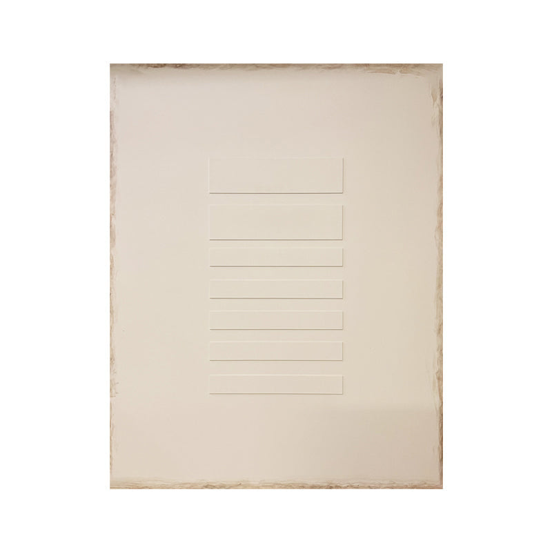 שבעה מלבנים לבנים בולטים על רקע בגוון בז', מסודרים בקומפוזיציה מדויקת עם מס