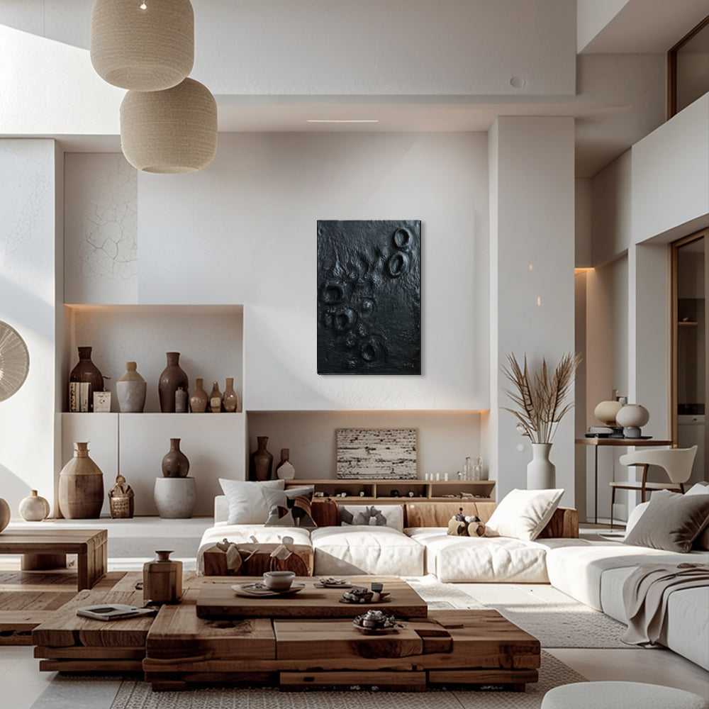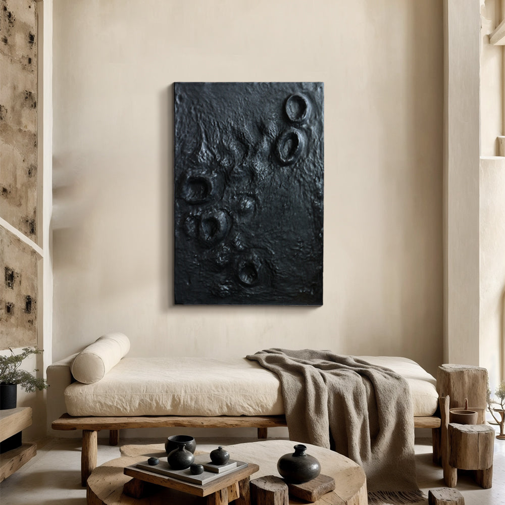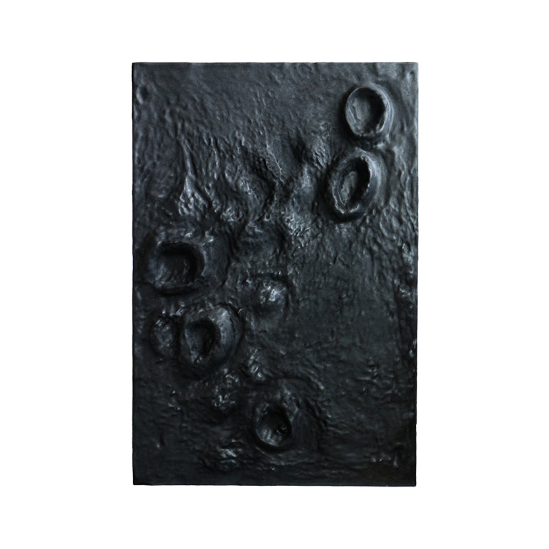 מרקם שחור עם שקעים עגולים, יוצר תחושת עומק ומסתורין כמו פני ירח
