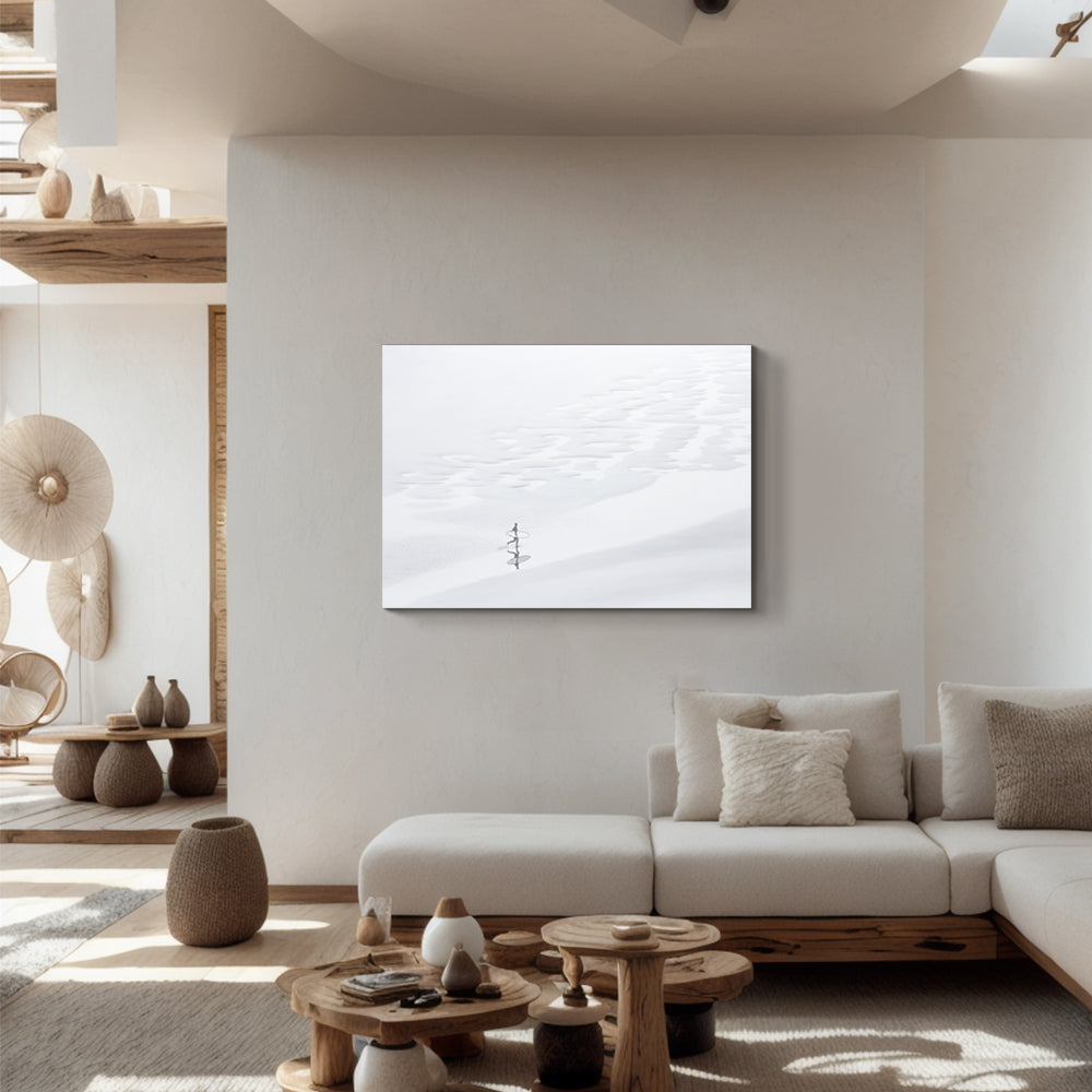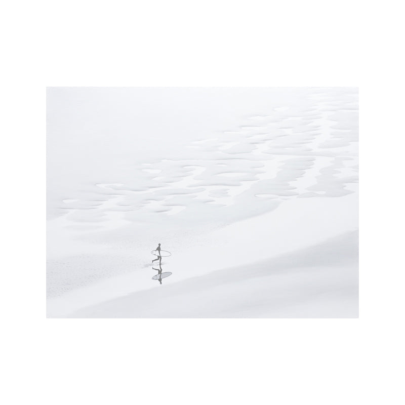 דמות קטנה ניצבת על חוף לבן אינסופי, משרה שלווה ובדידות