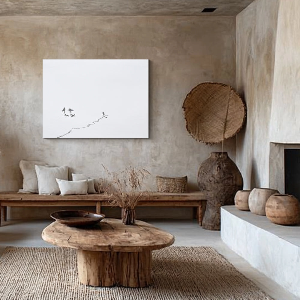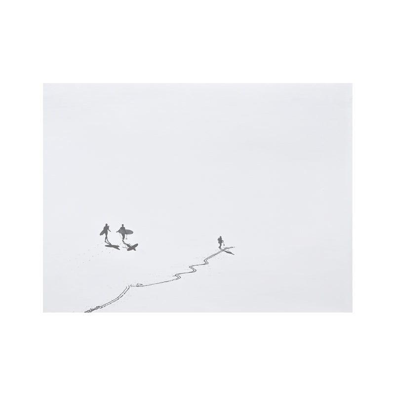 קבוצה של גולשים וצופה יחיד צועדים בחול, משאירים מאחור עקבות של מס