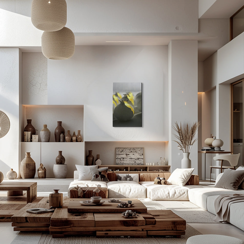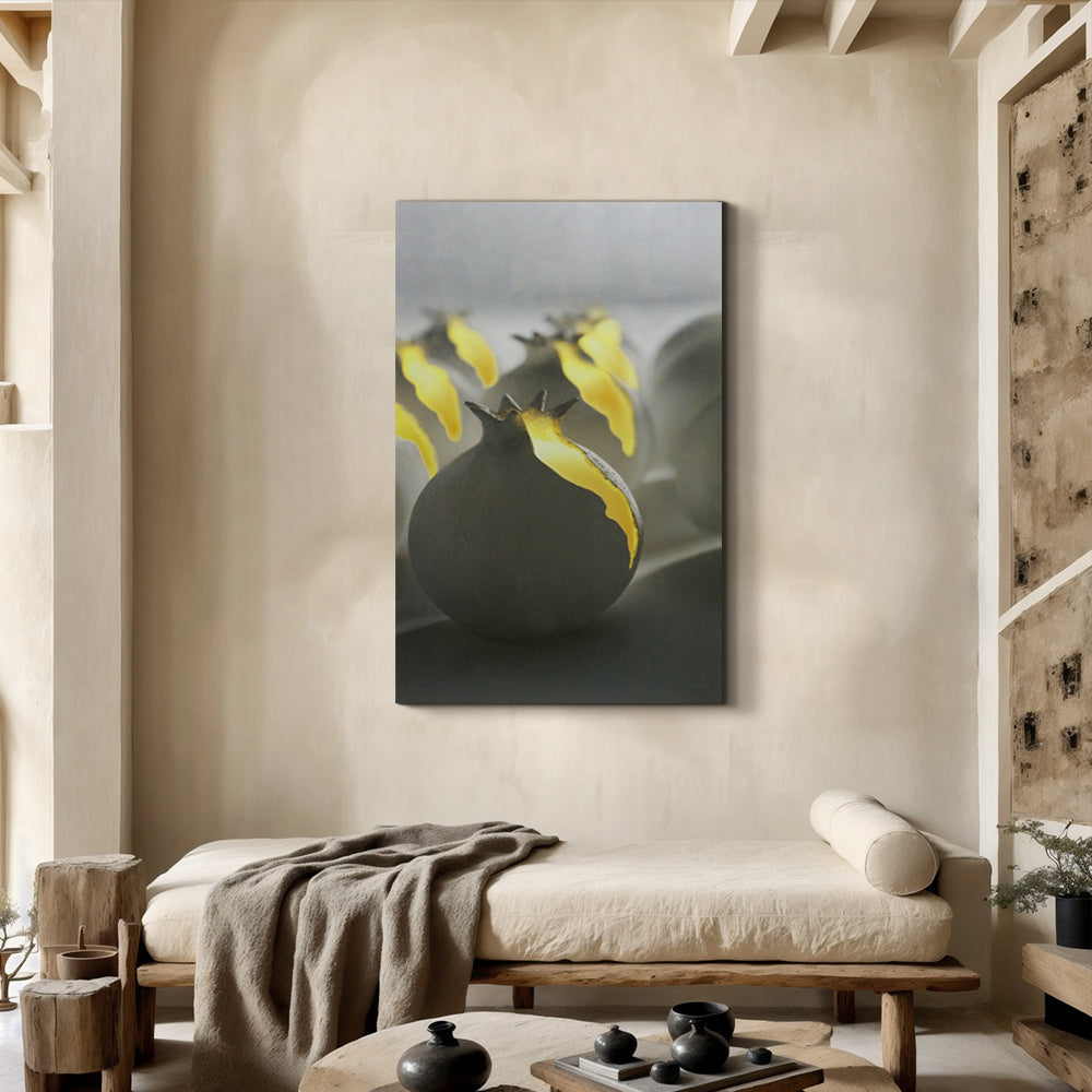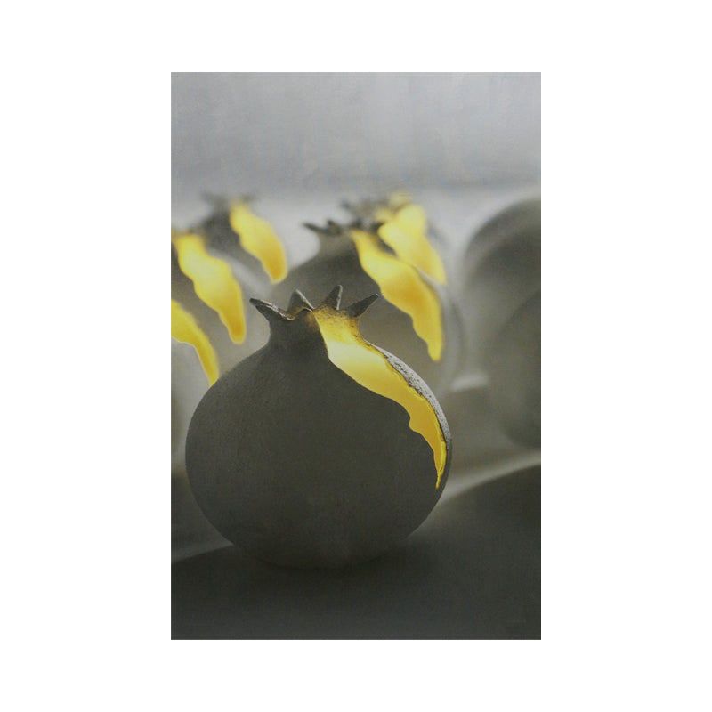 רימונים אפורים נבקעים ומפיצים אור צהוב פנימי, כמו סוד מואר שנחשף
