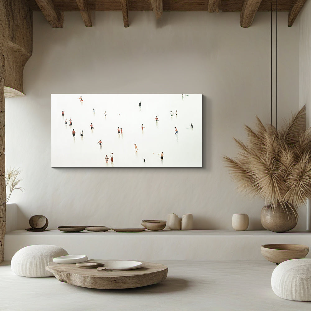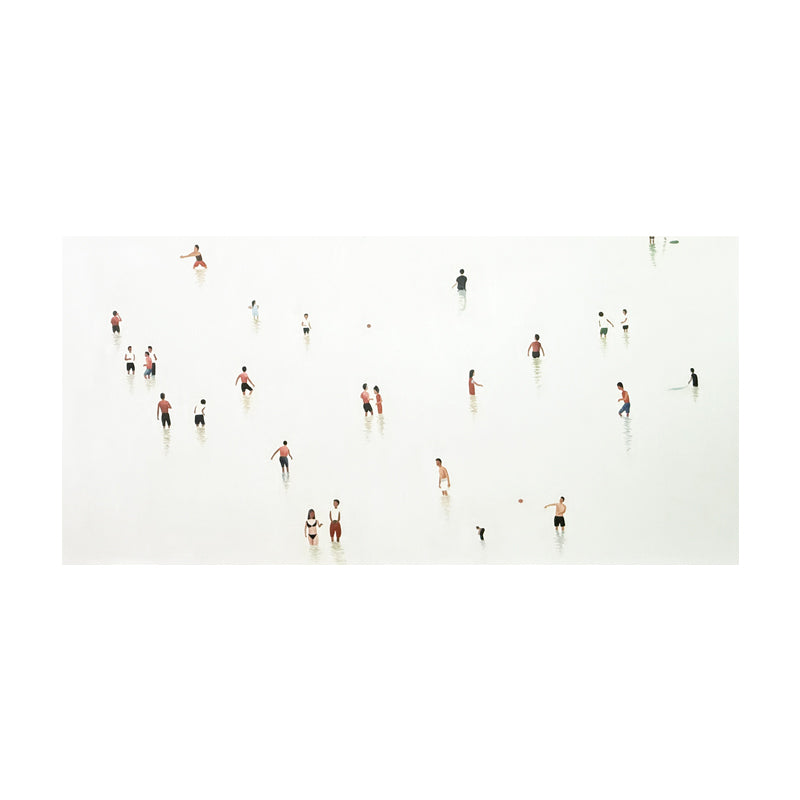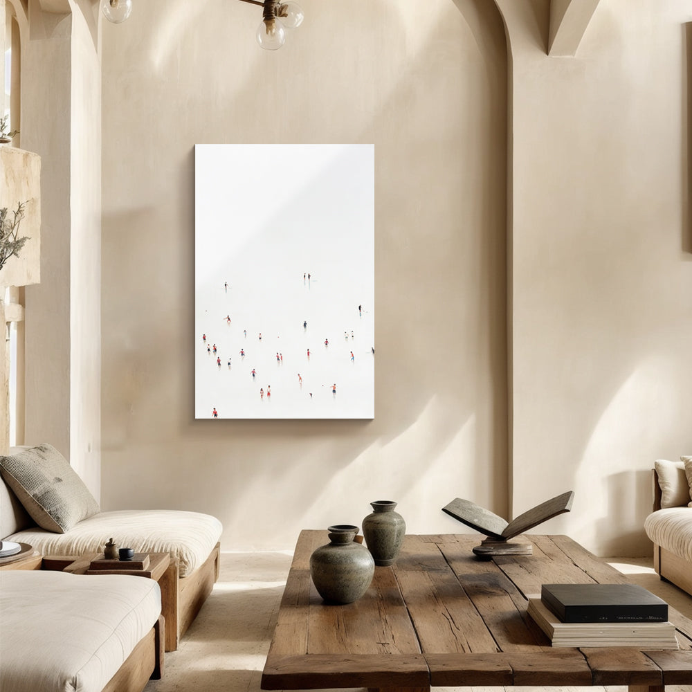 דמויות זעירות פזורות במרחב לבן, יוצרות תחושת שקט ומרחק, כמו זיכרון של יום קיץ רגוע