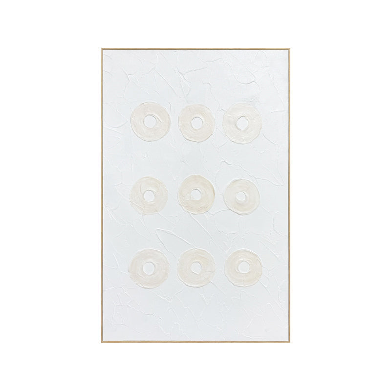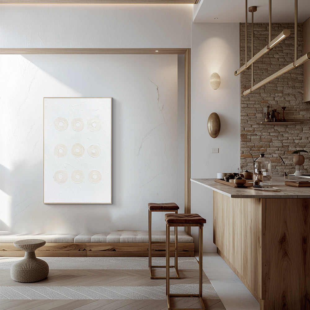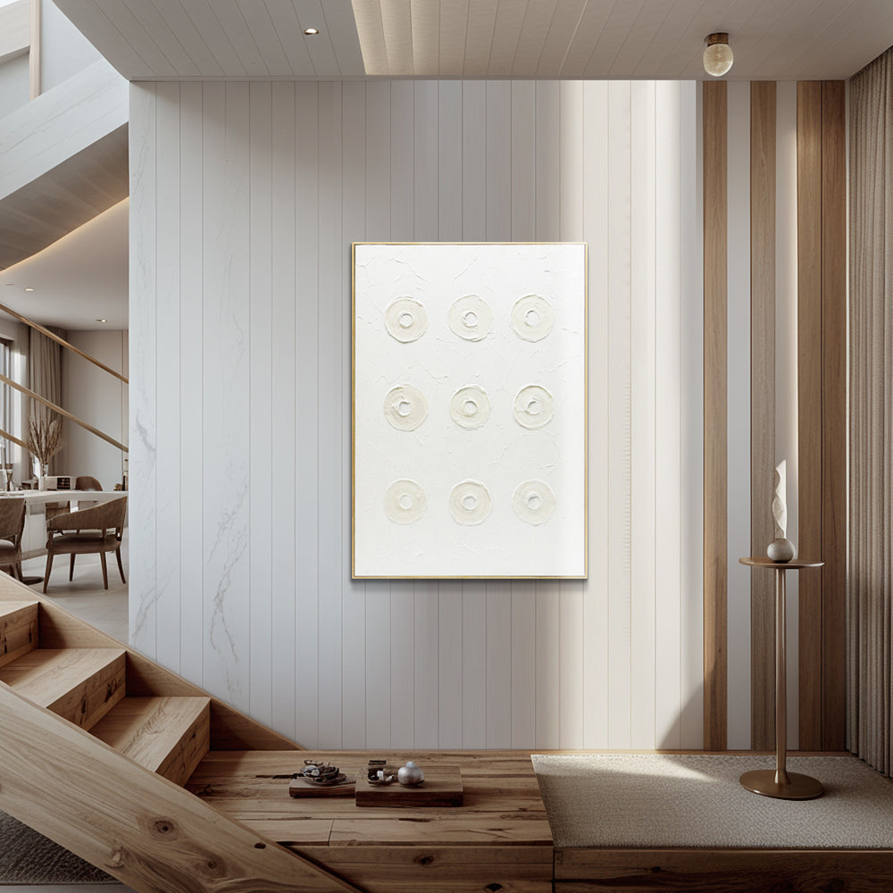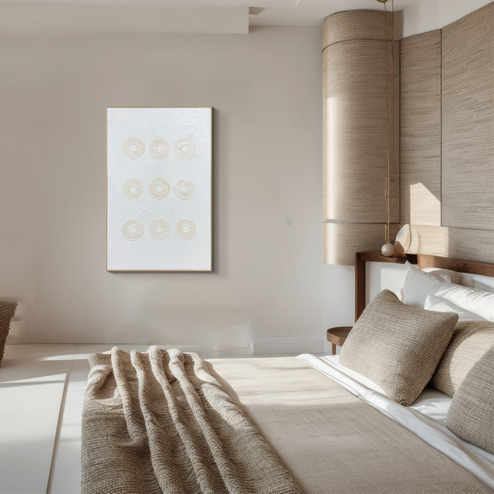 סדרת עיגולים טקסטורליים בתבנית סימטרית על רקע לבן, משדרים שלווה והרמוניה
